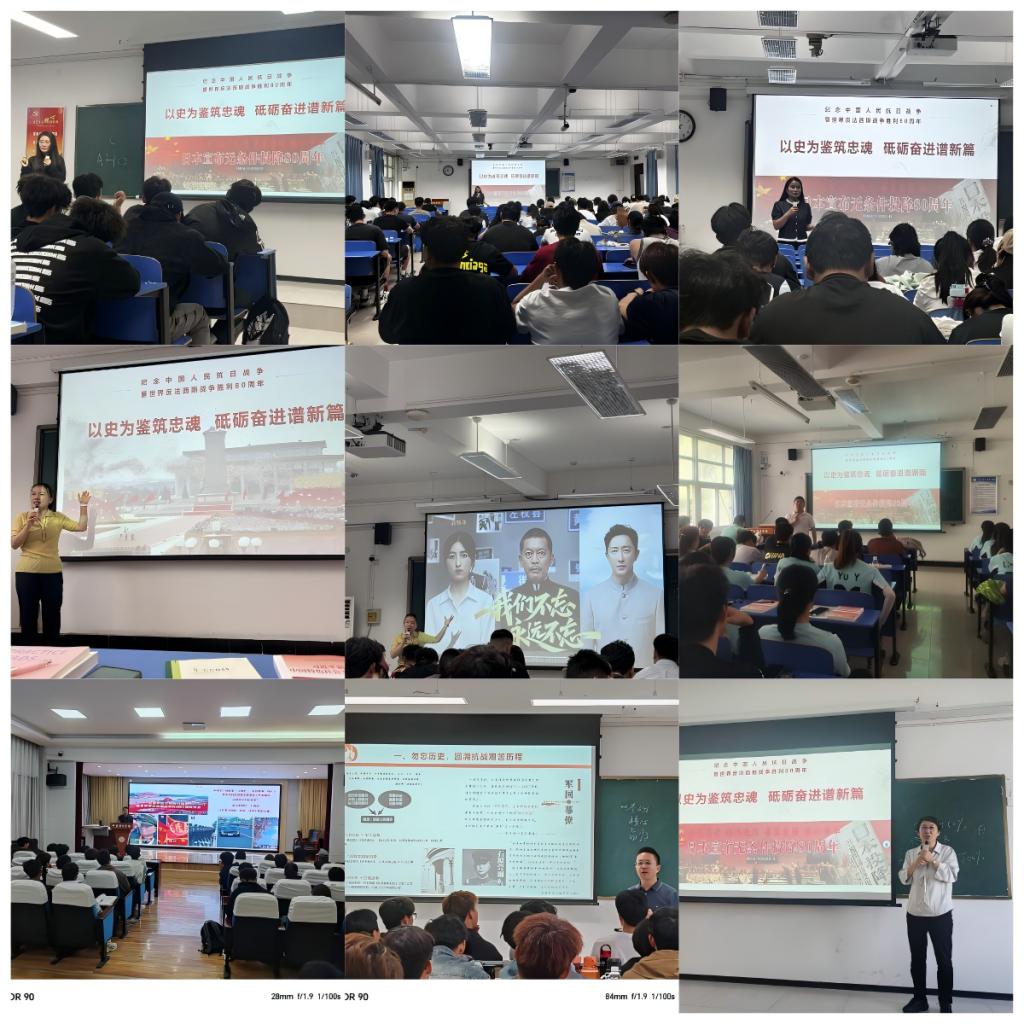 系列活动分阶段有序推进:9月3日,思政课教师与各班级学生开启线上联动,共同收看国家纪念中国人民抗日战争暨世界反法西斯战争胜利80周年大会实况。通过沉浸式学习强化红色基因传承,推动爱国主义情感从“入眼入耳”走向“入脑入心”,真正实现内化于心、外化于行。9月8日至26日,全体思政课教师在惠济校区、登封校区同步开展“开学第一课”专题教学——以“九一八事变”“七七事变”等关键历史节点为切入点,结合详实影像史料全景回溯中华民族十四年抗战的艰辛历程,深刻阐释中国共产党在抗战中的中流砥柱作用;同时关联新时代伟大变革与辉煌成就,帮助学生清晰把握当代中国的历史方位与发展机遇,明确新时代青年的使命担当。