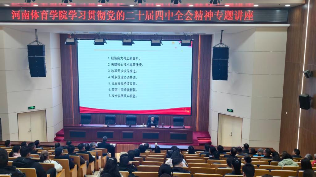 11月20日,河南体育学院学习贯彻党的二十届四中全会精神专题讲座在图文信息楼报告厅举行,河南省委党校(河南行政学院)原教育长、党组成员、省委党校研究生导师组组长丁素教授应邀做专题宣讲。校党委理论学习中心组全体成员、党员干部和教师代表近200人参加了学习。校领导董庆主持讲座。