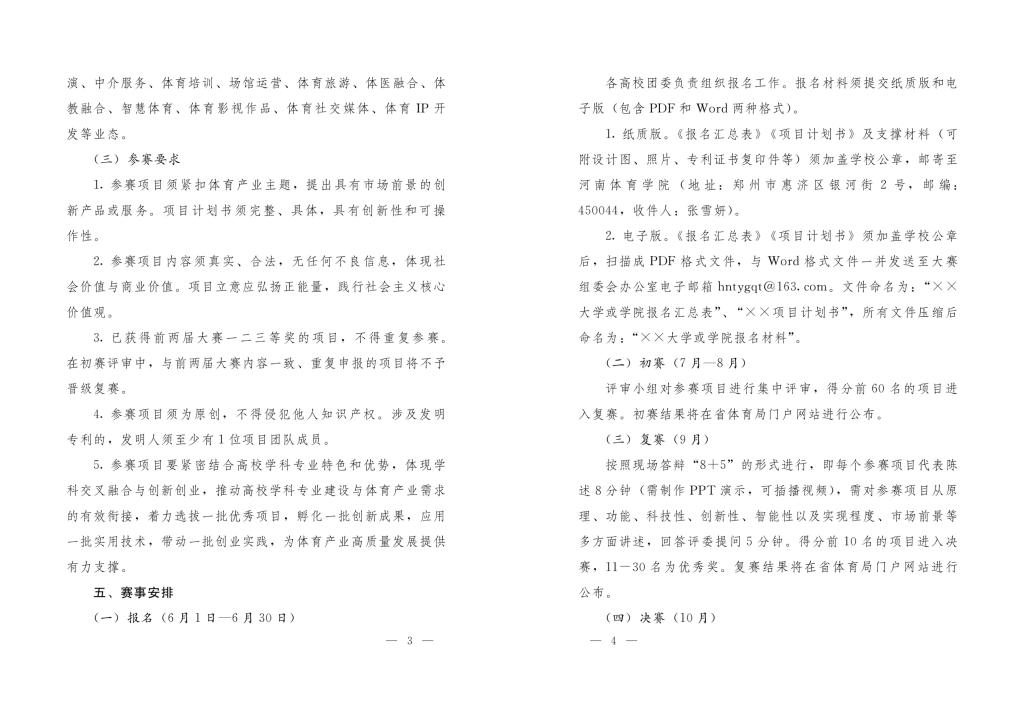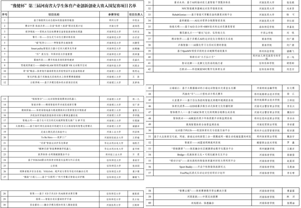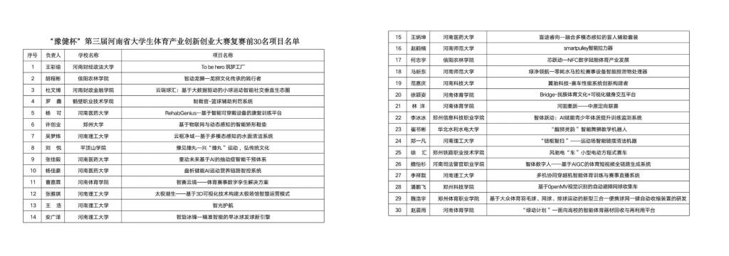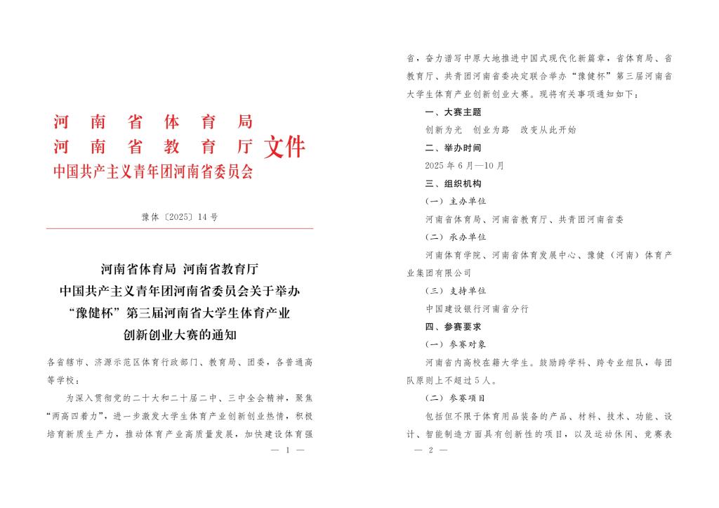 为深入贯彻党的二十大和二十届二中、三中、四中全会精神,聚焦“两高四着力”,进一步激发大学生体育产业创新创业热情,积极培育新质生产力,推动体育产业高质量发展,加快建设体育强省,奋力谱写中原大地推进中国式现代化新篇章,6月-11月期间,“豫健杯”第三届河南省大学生体育产业创新创业大赛在我校举行。本届大赛由河南省体育局、河南省教育厅、共青团河南省委联合主办,河南体育学院、河南省体育发展中心、豫健体育产业集团有限公司联合承办,建设银行河南省分行提供支持。