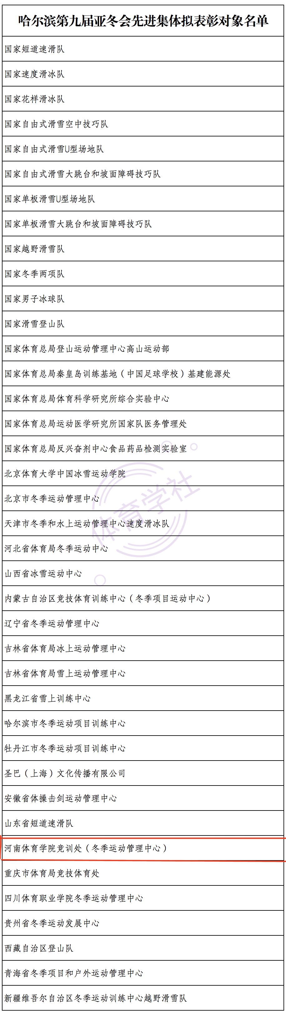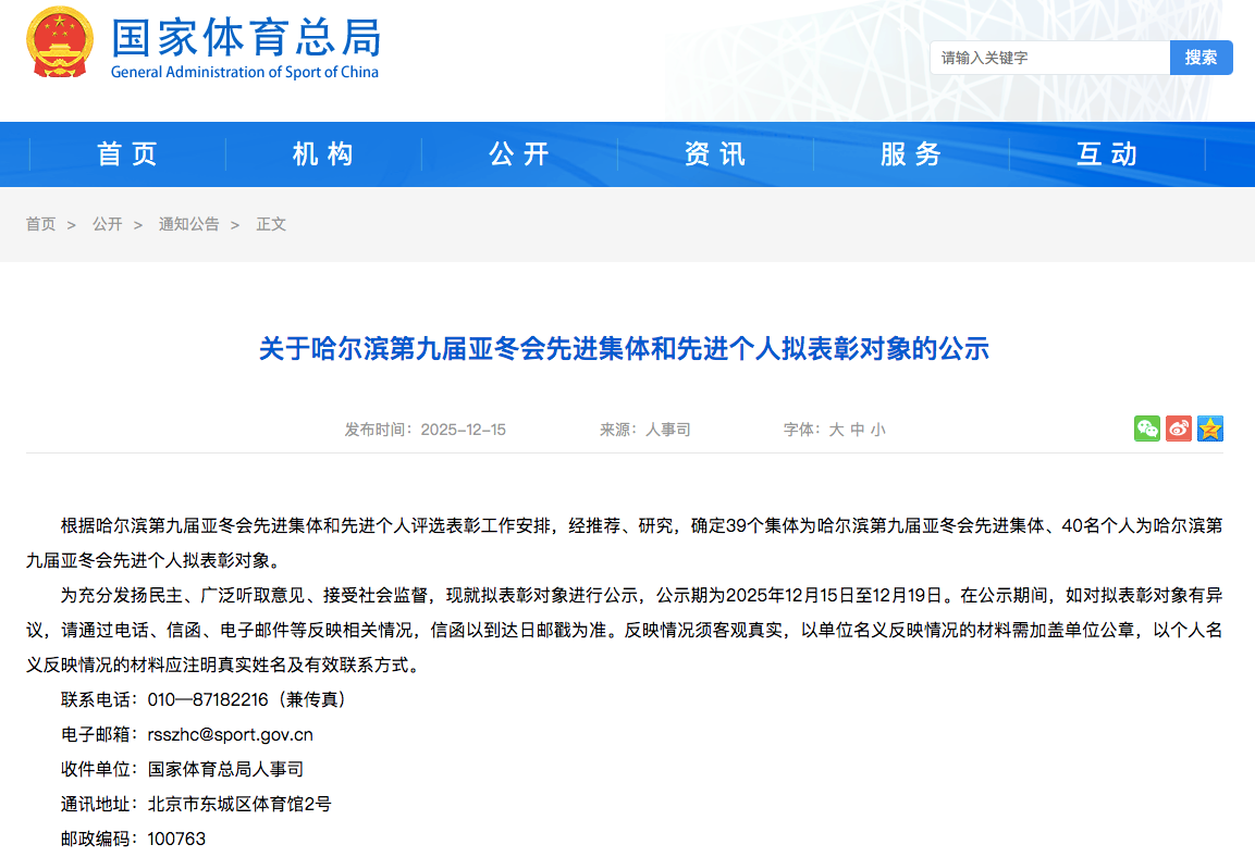 近日,国家体育总局官网发布《关于哈尔滨第九届亚冬会先进集体和先进个人拟表彰对象的公示》。根据该评选表彰工作安排,经推荐申报、综合研究等规范程序,最终确定39个先进集体、40名先进个人为拟表彰对象,我校竞训处(冬季运动管理中心)获评先进集体。